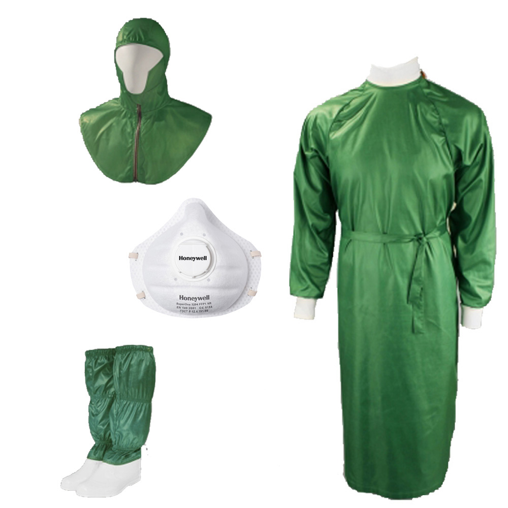Комплект обеспечивает защиту кожных покровов рук, поверхности тела, лица и органов дыхания. Покрой халата обеспечивает плотное, но комфортное прилегание в области шеи и на запястьях. Благодаря специальным вставкам на шлеме, все участки лица надежно защищены. Ткань с водоотталкивающей пропиткой и специальная технология швов обеспечивают надежную защиту оператора. В комплект также входят бахилы на легкой гипалоновой подошве.
